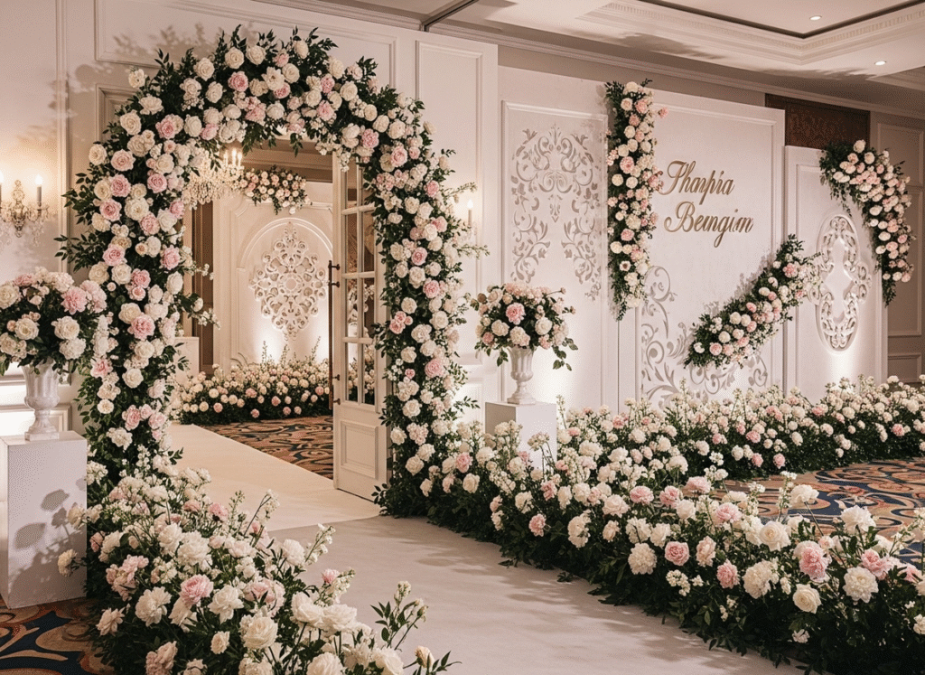 Beeindruckende Blumenbögen, Wandinstallationen und Raumdekoration.
